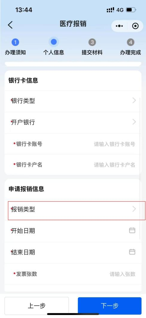 填寫個(gè)人信息,報(bào)銷類型可以選擇“門診費(fèi)用報(bào)銷”或“住院費(fèi)用報(bào)銷”。