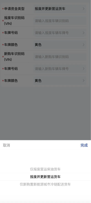 3.請根據自身情況選擇“僅報廢老舊營運貨車、報廢并更新營運貨車、僅新購新能源城市冷鏈配送貨車”三種類型之一進行申報,提交后不得更改。