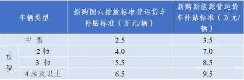 3.對距離強制報廢年限不滿一年的國四及以下排放標準營運貨車實施報廢,并新購中重型國六排放標準貨車或新能源貨車的,按照新購補貼標準予以補貼;對掛車不予補貼。