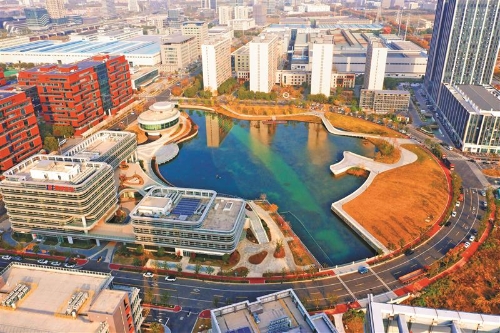 在現場,記者看到了一幅產業與生態相融共生的美好畫卷:產業載體的玻璃幕墻與鋼鐵交織的冷硬質感,被溫潤的湖水悄然“融化”;小三五成群在湖面上悠然“踱步”,戴勝鳥在岸邊發出“咕咕—咕咕—咕咕”的鳴唱;景觀廊道上還能看到孩子們歡快玩耍的身影……