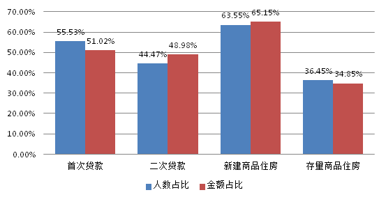 從貸款群體來看,剛需與改善型住房需求職工分別占貸款總?cè)藬?shù)的27.82%和64.42%。從單位性質(zhì)來看,以其他城鎮(zhèn)企業(yè)職工為主,貸款筆數(shù)和貸款金額占比分別為40.49%、39.18%。從購(gòu)房面積來看,職工貸款購(gòu)買小于90㎡、90-120㎡房屋居多,分別占貸款總?cè)藬?shù)的27.82%、38.25%。從主借人繳存基數(shù)來看,貸款主要以中、低收入職工為主,分別占貸款總?cè)藬?shù)的35.13%、63.06%。從貸款類型來看,純公積金貸款和組合貸款占比分別為45.99%、54.01%。從貸款結(jié)構(gòu)來看,首次公積金貸款職工占貸款總?cè)藬?shù)的55.53%,第二次住房公積金貸款人數(shù)占44.47%,說明我市住房公積金貸款政策在保障剛需職工需求,體現(xiàn)住房公積金互助性方面發(fā)揮了較大的作用,住房公積金制度的初衷未改變。具體放貸結(jié)構(gòu)如下: