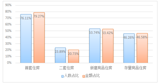 從貸款群體來看,剛需與改善型住房需求職工分別占貸款總人數的27.03%和65.92%。從單位性質來看,以城鎮私營企業及其他城鎮企業職工為主,貸款筆數和貸款金額占比分別為59.83%、58.44%。從購房面積來看,職工貸款購買90(不含)-120㎡房屋居多,占貸款總人數的41.73%。從主借人繳存基數來看,貸款主要以中、低收入職工為主,分別占貸款總人數的27.09%、71.27%。從貸款類型來看,純公積金貸款和組合貸款占比分別為36%、64%。從貸款結構來看,首套住房公積金貸款職工占貸款總人數的76.11%,二套住房公積金貸款人數占23.89%。具體放貸結構如下: