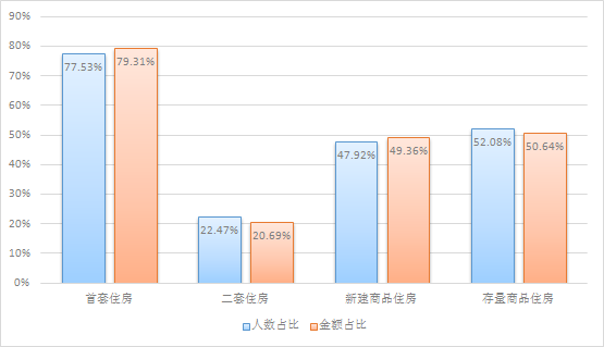 從貸款群體來看,剛需與改善型住房需求職工分別占貸款總人數的26.88%和66.05%。從單位性質來看,以城鎮私營企業及其他城鎮企業職工為主,貸款筆數和貸款金額占比分別為57.28%、55.61%。從購房面積來看,職工貸款購買90(不含)-120㎡房屋居多,占貸款總人數的40.86%。從主借人繳存基數來看,貸款主要以中、低收入職工為主,分別占貸款總人數的25.02%、73.83%。從貸款類型來看,純公積金貸款和組合貸款占比分別為48.74%、51.26%。從貸款結構來看,首套住房公積金貸款職工占貸款總人數的77.53%,二套住房公積金貸款人數占22.47%。具體放貸結構如下:
